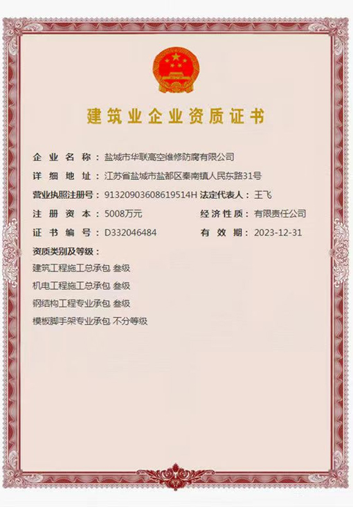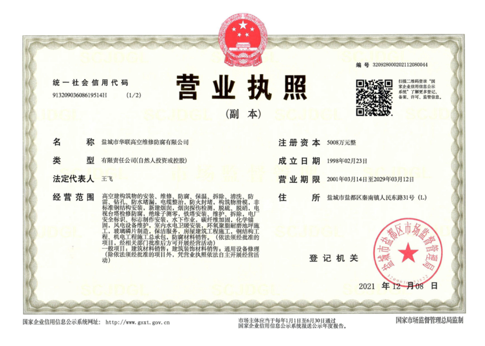 鹽城市華聯高空維修防腐有限公司始建于上世紀八十年代,系專業從事風力發電機塔筒防腐,塔筒維護,塔筒補漆,塔筒噴字等工程。不停產,不搭手架,高空懸吊施工的一級高空安全資質、一級高空防腐施工資質、二級建筑施工資質的高空建修、防腐工程、公司?,F已發展集科研、設計、施工為一體的的江蘇省較大的高空建修,高空防腐施工企業;公司注冊資金3008萬元,流動資金8000多萬元;擁有高修技術科研高修工程設計、高修工程施工三大技術與施工組織體系;公司擁有一流的技術施工隊伍,其中有高級職稱36 名,中級職稱126人。具備一級防腐資質、一級安全資質及二級建筑資質,公司下轄五個分公司和十八個辦事處,為全國數百家企業解決了若干“高、大、難”的特殊工程項目,填補了我國建筑史上的空白。      風電塔筒分公司專業承接風電場風機塔筒維護,風機塔筒除銹防腐,風機塔筒油漆修補,風機塔筒噴字寫字,風機塔筒vi標識施工公司等工程的施工,主要應用于風力發電公司、風電場、風電塔筒制造廠家以及風力發電機主機廠家。公司承諾:凡由我司施工過的單位,在保質期內我司定期回訪或電話聯絡,詢問工程質量情況;若在保質期內有質量問題我司免費維修。       我公司先后為江蘇龍源風力發電有限公司、河北龍源風力發電有限公司、海南龍源風力發電有限公司峨蔓風電場、云南龍源風力發電有限公司楊梅山風電場、龍源雄亞福清風力發電有限公司、龍源平潭風力發電有限公司、龍源莆田風力發電有限責任公司、福建東山澳仔山風電開發有限公司、福建省平潭長江澳風電開發有限公司、龍源(濱州)風力發電有限公司、龍源(張家口)風力發電有限公司、江蘇保龍塔筒制造有限公司、江蘇宇杰鋼機有限公司、江蘇金鋒佳特機電有限公司、無錫寶南機械制造有限公司、上海電氣風能設備有限公司、國華瑞豐榮成風力發電有限公司、中電國際新能源有限公司、中節能甘肅風力發電有限公司、中船重工重慶海裝風電設備有限公司、內蒙古金崗重工有限公司、內蒙古三興重工有限公司、內蒙古新錦風力發電有限公司、內蒙古國網新源控股有限公司、內蒙古同盛風電設備有限公司、內蒙古國電投資股份有限公司風電分公司、山東長島風力發電有限責任公司、中國石油天然氣第七建設公司、甘肅中電科耀新能源裝備有限公司、葛洲壩集團機電建設有限公司、中國華電重工集團有限公司、北京京能新能源有限公司、通榆東寶風電塔筒制造有限公司等風力發電機塔筒進行維護、防腐、刷漆、補漆、清洗、噴字、寫字以及葉片的清洗、防腐、探傷、檢修、美化等項目。由于風場的特殊氣候和風速的影響,經過我公司與各公司風場的配合以及我公司嚴格的管理規章制度,所有的項目都順利完工并驗收合格質量優。 華聯的昨天感謝您的信任和關心 華聯的明天更需要您的厚愛和支持 華聯人將不斷拓新進取,為人類的發展建設和生態環境的保護作出更大的貢獻...